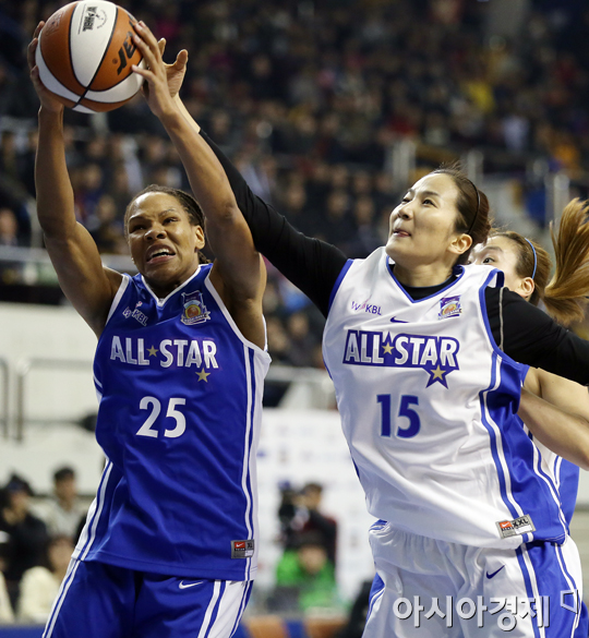 [춘천=아시아경제 정재훈 기자] 5일 오후 강원도 춘천 호반체육관에서 열린 우리은행 2013∼2014 여자프로농구’ 올스타전. 남부선발 커리와 중부선발 신정자가 리바운드를 다투고 있다. 정재훈 기자 roze@asiae.co.kr<ⓒ세계를 보는 창 경제를 보는 눈, 아시아경제(www.asiae.co.kr) 무단전재 배포금지>