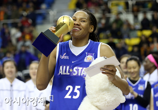 [춘천=아시아경제 정재훈 기자] 5일 오후 강원도 춘천 호반체육관에서 열린 우리은행 2013∼2014 여자프로농구’ 올스타전. MVP로 선정된 모니크 커리가 트로피에 입을 맞추고 있다. 정재훈 기자 roze@asiae.co.kr<ⓒ세계를 보는 창 경제를 보는 눈, 아시아경제(www.asiae.co.kr) 무단전재 배포금지>