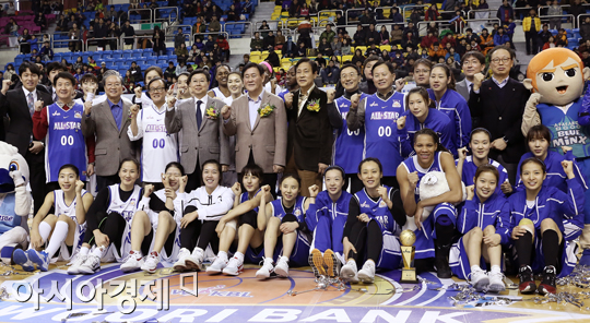 [춘천=아시아경제 정재훈 기자] 5일 오후 강원도 춘천 호반체육관에서 열린 우리은행 2013∼2014 여자프로농구’ 올스타전. 최경환 WKBL 총재, 각 구단 구단주들과 올스타전에 참가한 선수들이 기념촬영을 하고 있다. 정재훈 기자 roze@asiae.co.kr<ⓒ세계를 보는 창 경제를 보는 눈, 아시아경제(www.asiae.co.kr) 무단전재 배포금지>