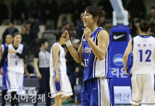 [춘천=아시아경제 정재훈 기자] 5일 오후 강원도 춘천 호반체육관에서 열린 우리은행 2013∼2014 여자프로농구’ 올스타전. 남부선발 김단비가 승리에 기뻐하고 있다. 정재훈 기자 roze@asiae.co.kr<ⓒ세계를 보는 창 경제를 보는 눈, 아시아경제(www.asiae.co.kr) 무단전재 배포금지>
