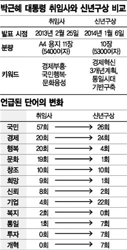 '경제'에 이어 대북정책을 언급하는 방식은 취임사나 신년구상이나 동일했다. 취임사 때는 "북핵을 용인하지 않을 것이며 주변국과 신뢰를 구축해 평화시대를 열겠다"는 메시지를 전했고 신년구상에서는 '통일에 준비하자'는 쪽으로 무게중심이 이동했다. ◆사라진 단어와 새로 뜬 단어 =기본틀은 유사하지만 내용으로 들어가면 정책 우선순위에 변화가 생긴 것을 감지할 수 있다. 취임사와 신년구상은 각각 A4 용지 11장과 10장으로 엇비슷한 분량인데, 가장 많이 언급된 단어는 '국민'으로 같았다. 다만 취임사 때 57번, 신년구상 26번으로 절반 이상 줄었다.정책목표로서 1순위는 역시 경제였다(취임사 20번, 신년사 24번). 취임사 때는 경제뿐 아니라 행복(20회), 문화(19회)에 비등한 무게를 뒀지만, 신년구상에서는 투자·개혁(7회), 혁신(6회), 변화(5회) 등이 그 자리를 대신했다. 반면 행복과 문화는 각각 4번과 1번으로 비중이 크게 감소했다. 희망(9번, 1번)이나 신뢰(8번, 2번) 등 손에 잡히지 않는 가치지향적 목표에 얽매이기보다 구체적 성과를 내는 쪽으로 국정을 이끌어가겠다는 의지로 풀이된다.신년구상에서 기업을 22번이나 언급한 것도 같은 맥락에 있다. 취임사에서는 4번에 그쳤던 단어다. 일자리(2회, 3회)에 대한 관심이나 창조(경제)를 주요 발전전략으로 삼고 있다는 점(10회, 10회)에는 변화가 느껴지지 않는다.◆경제민주화가 사라졌다?=박 대통령의 1년을 '부정적'으로 평가하는 쪽에선 이번 신년구상에서 '복지'나 '경제민주화'에 대해 언급이 없었다는 점에 주목한다. 두 과제는 박근혜 후보의 핵심공약이었기에, 당선 이후 '용도폐기'된 것 아니냐는 비판이다. 실제 취임사에선 경제민주화를 2번 언급했지만 신년구상에선 이 단어가 아예 사라졌다. '복지' 역시 취임사 2번, 신년사 0번이다. 하지만 내용을 살펴보면 꼭 그런 것도 아니다. 박 대통령은 신년구상에서 '중소기업'을 8번 언급했다. 취임사 때는 3번이었다. 중소기업에 대한 투자를 늘리고 애로를 해소하며 집중육성을 통해 경쟁력을 높이겠다는 게 신년구상의 내용이다. 대기업과 중소기업 간 불공평한 거래관행과 그로 인해 발생하는 취약한 경제체질을 개선하겠다는 점을 직접적으로 언급하진 않았지만, 기본적으로 우리 경제의 발전동력으로서 중소기업에 대한 관심이 사라지지 않았음을 방증하는 것으로 보인다. 반면 박 대통령이 대선공약과 취임사에서 3대 과제 중 하나로 꼽은 '복지'는 집권 2년차 '성장 우선' 정책에 의해 밀려났음은 분명해 보인다. 박 대통령은 신년구상에서 복지와 관련해 아무런 언급을 하지 않았고 이어진 질의응답 때도 "국민이 바라는 복지수준에 대해 국민의 합의가 필요하다" "예술인 복지를 개선하겠다"고 말한 게 전부다. '복지를 통한 국민행복'을 강조하느라 취임사에서 '행복'이란 단어를 20번 썼으나, 신년구상에서 4번으로 줄어든 것도 이런 맥락이다.취임사 땐 1번에 그쳤던 '통일'이 신년구상에서 7번이나 언급된 것도 눈에 띈다. 박 대통령은 이어진 기자회견에서 "통일이 우리 경제에 '도약의 기회'를 줄 것이며 이를 준비할 때가 됐다"는 취지로 부연 설명했다. 취임 당시엔 '핵을 용납할 수 없다'는 데 몰입했으나 지난 1년간 대북정책에서 생긴 자신감이 깔린 변화로 보인다.신범수 기자 answer@asiae.co.kr<ⓒ세계를 보는 창 경제를 보는 눈, 아시아경제(www.asiae.co.kr) 무단전재 배포금지>