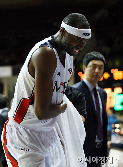 [안양=아시아경제 정재훈 기자] 7일 오후 안양실내체육관에서 열린 KB국민카드 2013~2014 프로농구 KGC와 모비스의 경기. 모비스 로드 벤슨이 경기 도중 근육 경련이 일어나 고통스러워하며 코트 밖으로 나오고 있다. 정재훈 기자 roze@asiae.co.kr<ⓒ세계를 보는 창 경제를 보는 눈, 아시아경제(www.asiae.co.kr) 무단전재 배포금지>