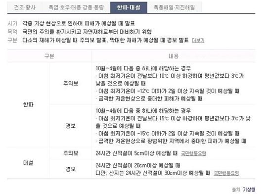 [아시아경제 온라인이슈팀] 한파주의보 기준이 눈길을 끌고 있다. 갑작스럽게 추워진 날씨 탓에 한파주의보에 대한 네티즌들의 관심이 높아졌기 때문이다. 최근 온라인 커뮤니티에 '한파주의보 기준'이라는 글이 게재됐다. 한파주의보는 전날보다 아침 최저기온이 10도 이상 떨어질 때 발령된다. 또 한파주의보는 10월부터 이듬해 4월까지 아침 최저기온이 전날보다 10도이상 하락해 평년값보다 3도가 낮을것으로 예상될 때, 아침 최저기온이 영하 12도 이하가 2일이상 지속될 때, 급격한 저온현상으로 광범위한 지역에 중대한 피해가 예상될 때 발효된다. 한파주의보 기준을 접한 네티즌들은 "한파주의보 기준, 보온에 특히 신경써야할 부위는 머리라는 것을 잊지말아야 한다", "한파주의보 기준, 국민행동요령도 있다는데 조심해야겠다", "한파주의보 미리 알고 대비해야겠다" 등의 반응을 보였다. 온라인이슈팀 <ⓒ세계를 보는 창 경제를 보는 눈, 아시아경제(www.asiae.co.kr) 무단전재 배포금지>