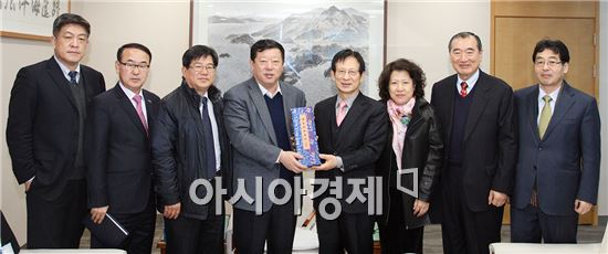 권종수 여수광양항만공사 사장 직무대행(오른쪽 네 번째)이 8일 공사를 방문한 중국 옌타이항무국 지샤오보 총재(왼쪽에서 네 번째)일행과 기념촬영을 하고 있다.