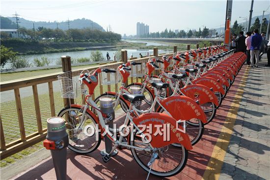 " 자전거 300대, 터미널 20개소, 이용건수 13만 건, 자전거 도시 입증"[아시아경제 노해섭 기자]순천시는 시민들의 근거리 교통수단 역할을 톡톡히 하고 있는 공영 ‘온누리자전거’가 시민들의 사랑을 받고 있다고 9일 밝혔다.지난 2009년 운영을 시작한 ‘온누리자전거’는 회원 수 5만 여명, 자전거 300대, 터미널 20개소, 대여료 수입 5천만 원 등으로 명실상부한 자전거 도시 입증에 일조했다. 특히 자전거 대여횟수는 2011년 5만6천 건에서 2012년 10만 건, 지난해 13만 건까지 늘었고, 회원 수도 매년 만 명 이상 증가하고 있다.온누리자전거 이용 활성화는 먼저, 1년 2만원이란 적은 비용과 자전거 보험 가입, 도시 곳곳에 정비된 자전거 도로, 어디서든 쉽게 빌릴 수 있는 여건 등 순천시의 자전거 이용 인프라 조성이 일조했다.특히, 순천만과 동천을 잇는 아름다운 자전거 도로는 지역 동호회뿐만 아니라 타 지역 동호회에서도 높은 인기를 얻고 있다.시 관계자는 "온누리 자전거는 곳곳에 설치되어있는 터미널에서 쉽게 빌리고, 어디서든 반납할 수 있어 학교통학 수단으로, 동천에서는 건강을 위한 운동수단으로, 친구들과 레저수단 등 다목적으로 이용되고 있다"며 "지속적인 자전거 관리로 시민 이용에 불편함이 없도록 할 계획"이라고 말했다.한편 순천시는 올 해 정원박람회장, 신대지구, 용당동 등에 자전거 터미널 4~5곳을 추가 신설하고 오는 3월 초 ‘자전거문화센터’를 개관, 대표적인 자전거 거점도시로 거듭날 예정이다.기타 자세한 사항은 시 도로과(061-749-6362)로 문의하면 된다. 노해섭 기자 nogary@<ⓒ세계를 보는 창 경제를 보는 눈, 아시아경제(www.asiae.co.kr) 무단전재 배포금지>