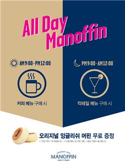 [아시아경제 이광호 기자]MPK그룹이 운영하는 프리미엄 베이커리 카페 마노핀은 다음달 7일까지 '올 데이 마노핀(All day Manoffine)' 캠페인을 진행한다고 9일 밝혔다. 이 캠페인은 평일 아침과 저녁에 각각 커피와 칵테일 구매시 오리지널 잉글리쉬 머핀을 무료로 즐길 수 있는 타임이벤트다.마노핀에서는 국내 소비자들에게 머핀으로 알려진 화려하고 달콤한 컵케이크와 달리 동그랗고 납작한 모양의 담백한 영국 전통 머핀을 즐길 수 있다. 평일 오전 9시∼12시에 커피 메뉴 구매 시, 오후 9시∼12시에는 칵테일 메뉴를 구매 시 오리지널 잉글리쉬 머핀을 무료로 제공한다.이광호 기자 kwang@asiae.co.kr<ⓒ세계를 보는 창 경제를 보는 눈, 아시아경제(www.asiae.co.kr) 무단전재 배포금지>