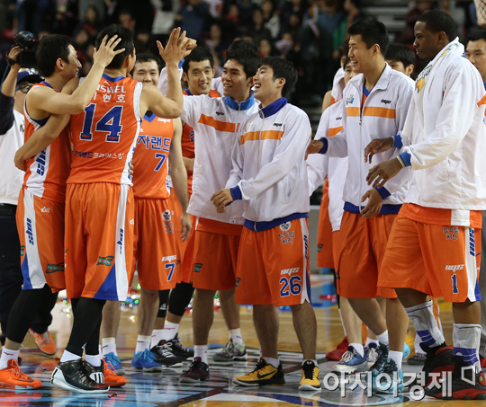 [인천=아시아경제 정재훈 기자] 9일 오후 인천 삼산월드체육관에서 열린 KB국민카드 2013~2014 프로농구 전자랜드와 SK의 경기. 75:66 승리를 거둔 전자랜드 선수들이 기쁨을 나누고 있다. 정재훈 기자 roze@asiae.co.kr<ⓒ세계를 보는 창 경제를 보는 눈, 아시아경제(www.asiae.co.kr) 무단전재 배포금지>