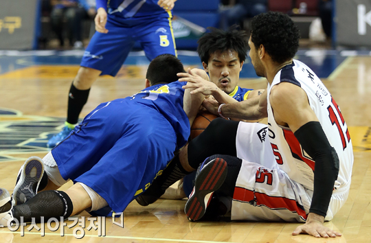 [아시아경제 정재훈 기자] 10일 오후 서울 잠실실내체육관에서 열린 'KB국민카드 2013~2014 프로농구' 삼성과 모비스의 경기. 삼성 이동준, 차재영과 모비스 문태영이 넘어진 상태에서 공을 다투고 있다. 정재훈 기자 roze@asiae.co.kr<ⓒ세계를 보는 창 경제를 보는 눈, 아시아경제(www.asiae.co.kr) 무단전재 배포금지>