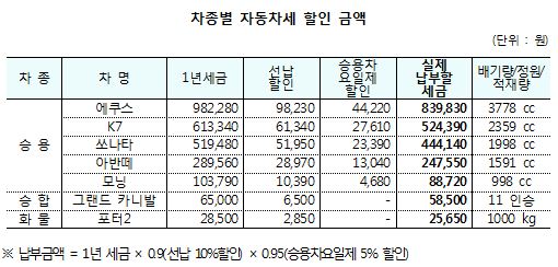 [아시아경제 이혜영 기자] 내달 초까지 자동차세 1년분을 미리 납부하면 최대 14.5%의 세금감면 혜택이 적용된다. 자동차세 납부 고지서는 매년 6월과 12월 두차례 발송되지만, 1월에 연간 부과액을 모두 납부하면 10% 할인혜택이 부여되고 승용차요일제에 참여하는 차량은 5% 추가 할인이 가능하다. 올해는 설 연휴를 고려해 납부기한이 2월 3일까지 연장됐다. 서울시는 지난해 자동차세 선납자와 올해 신규 신청자 103만명에게 총 2344억원의 자동차세 납부서를 일괄 발송했다고 13일 밝혔다.