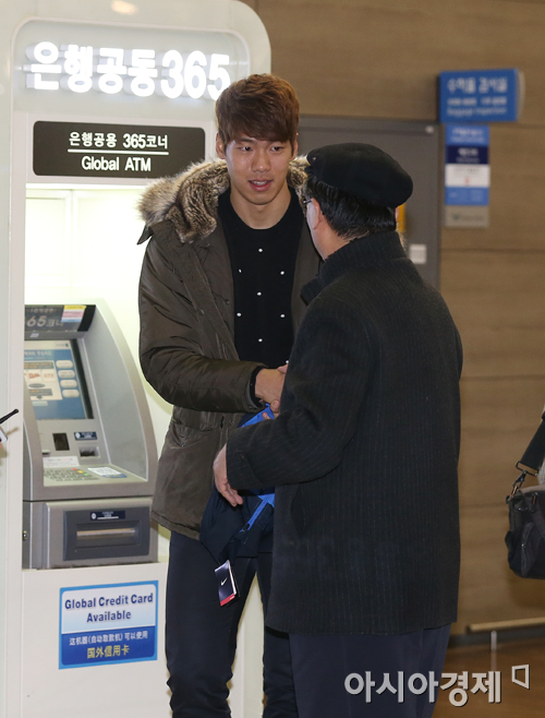 [인천=아시아경제 정재훈 기자] 브라질과 미국 전지훈련을 떠나는 축구국가대표팀이 13일 오후 인천국제공항을 통해 출국했다. 이범영이 중년의 팬과 악수를 나누고 있다. 정재훈 기자 roze@asiae.co.kr<ⓒ세계를 보는 창 경제를 보는 눈, 아시아경제(www.asiae.co.kr) 무단전재 배포금지>