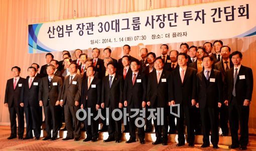 [아시아경제 최우창 기자]윤상직 산업통상자원부 장관이 14일 서울 중구 플라자호텔에서 열린 '30대그룹 사장단 투자 간담회' 에 참석, 참석자들과 기념사진 촬영을 하고 있다.윤 장관은 이 자리에서 산업통상자원부가 올해 규제개혁과 기업환경 안정화, 산업현장 인력난 해결 등을 중점 과제로 추진하는 3대 핵심과제를 발표했다. 최우창 기자 smicer@asiae.co.kr<ⓒ세계를 보는 창 경제를 보는 눈, 아시아경제(www.asiae.co.kr) 무단전재 배포금지>
