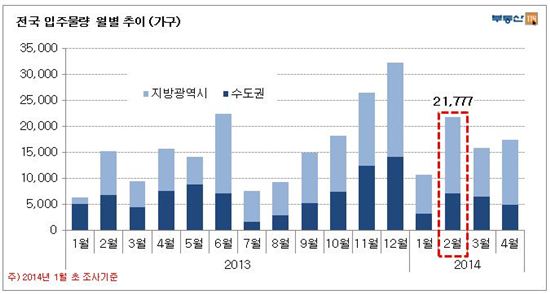 [아시아경제 배경환 기자] 내달 전국에 2만2000여가구가 집들이를 한다. 봄 이사철을 앞두고 전세시장 안정에 영향을 줄 지 관심이 모아진다.14일 부동산114에 따르면 2월 전국에는 2만1777가구가 입주를 시작한다. 1만752가구가 입주한 지난달보다 1만1025가구, 전년동기보다는 6534가구 많은 양이다. 2월 입주물량만 보면 2009년(2만3839가구) 이후 최대치다.특히 지방광역시 입주물량이 눈에 띈다. 2월 지방광역시 새 아파트는 총 1만4603가구로 전체 물량의 67%를 차지한다. 수도권은 7174가구가 입주한다. 전체의 절반이 되지 않는 물량이지만 3~4월은 수도권 입주물량이 소폭 줄어들 것으로 예상돼 새 아파트 전세수요자라면 빠르게 움직일 필요가 있다. 이중 2월 수도권 입주물량은 총 7174가구로 전월대비 3961가구 늘어났다. 서울은 전월(588가구)보다 2095가구 증가한 2683가구가 집들이를 한다. 대치 우성2차를 리모델링한 래미안하이스턴과 왕십리뉴타운2구역에 위치한 텐즈힐2차 등이 입주한다. 경기는 4226가구, 8개 단지가 입주를 시작한다. 별내지구, 광교신도시와 수원 입북동에 위치한 대규모 단지(1366가구)가 입주해 살펴볼 만 하다. 인천은 남구 도화동에 위치한 대성유니드(265가구)가 입주한다.이밖에 지방과 광역시에서는 1만4603가구가 입주를 시작한다. 전월보다 2배 가량 증가한 물량이다. 1000가구 이상의 대규모 단지와 혁신도시 입주가 진행된다. 지역별로는 ▲전남 3190가구 ▲울산 2098가구 ▲대전 1885가구 ▲전북 1828가구 등이다.