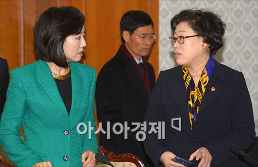 [아시아경제 윤동주 기자] 16일 서울청사에서 열린 국가정책조정회의에 참석한 윤진숙 해양수산부 장관(오른쪽)과 조윤선 여성가족부 장관이 회의 시작 전 의견을 나누고 있다.윤동주 기자 doso7@asiae.co.kr<ⓒ세계를 보는 창 경제를 보는 눈, 아시아경제(www.asiae.co.kr) 무단전재 배포금지>