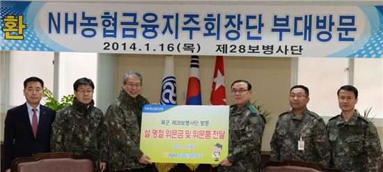 16일 임종룡 NH농협금융 회장(왼쪽 세 번째)이 육군 제28사단을 방문해 이순광 소장(왼쪽 네 번째)에게 위문금과 위문품을 전달한 뒤 기념촬영을 하고 있다.