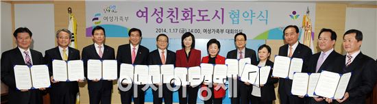 [아시아경제 이진택기자 ]이환주 남원시장은 17일 여성가족부 대회의실에서 조윤선 여성가족부 장관과 ‘여성친화도시 조성 협약식’을 가졌다. 협약식에서 조윤선 장관은 여성친화도시 협약서에 서명하고 현판을 증정하며, 양성이 평등한 지역사회 조성과 주민의 삶의 질 향상을 위하여 상호 협력키로 했다. 남원시는 그동안 이환주 시장의 공약사업인 여성친화도시를 추진하기 위해 주무부서에 전담인력을 배치하고, 여성친화도시 조성 협의체 구성과 여성정책 중장기 발전 계획을 수립하고 성평등 기본 조례를 마련하는 등, 적극적인 노력을 기울여 왔다. 또한, 시청사에 모유수유실 조성, 공용주차장에 여성 배려주차장 설치, 시립도서관 영·유아실 개선 등 다양하고 적극적인 사업을 통해 긍정적인 평가를 받았다. 이환주 시장은 ‘여성친화도시 선정을 계기로 여성들이 더욱 행복하고 더불어 시민 모두가 행복한 생활을 할 수 있도록 더욱 힘쓸 것’이라고 각오를 다졌다. 남원시는 ‘여성이 살기 좋은 도시, 모두가 행복한 남원!’ 이라는 슬로건을 내걸고 ‘경쟁력 있는 여성, 건강하고 행복한 삶, 활력 있고 인정 넘치는 지역공동체 조성’을 목표로 경로당 그룹-홈 사업, 산모·신생아 가정간호서비스, 골목길 CC-TV 및 가로등 확충, 여성농업인센터 운영 지원, 여성친화형 도시 공원 정비 등 다양한 사업 전개로 여성친화도시를 조성해 나갈 계획이다. 이진택 기자 <ⓒ세계를 보는 창 경제를 보는 눈, 아시아경제(www.asiae.co.kr) 무단전재 배포금지>