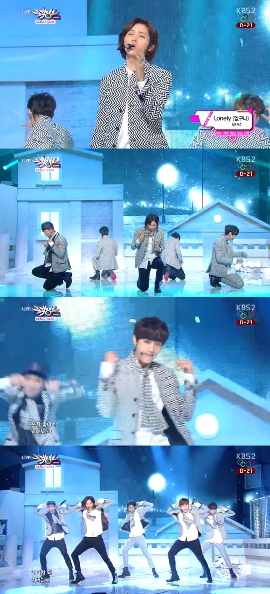 [아시아경제 e뉴스팀]그룹 비원에이포가 달콤한 목소리로 여성 관객들의 마음을 녹였다. 비원에이포는 17일 오후 방송한 KBS2 '뮤직뱅크'에 출연해 '론리'를 열창했다. 이날 이들은 깔끔한 정장 스타일 의상을 입고 등장해 부드러운 목소리의 화음으로 관객들의 뜨거운 호응을 이끌어냈다. '론리'는 알앤비 힙합장르의 곡으로, 실연의 아픔을 사실적으로 담아낸 노랫말이 인상적이라는 평이다. 한편 이날 방송에는 비, 동방신기, 에일리, 비원에이포, 달샤벳, 걸스데이, 와썹, 양지원, 비트윈, 탑독, 럼블피쉬, 김종서, 갓세븐, 로열 파이럿츠, 왁스, 에이오에이, 김경록이 출연했다. e뉴스팀 ent@asiae.co.kr<ⓒ세계를 보는 창 경제를 보는 눈, 아시아경제(www.asiae.co.kr) 무단전재 배포금지>