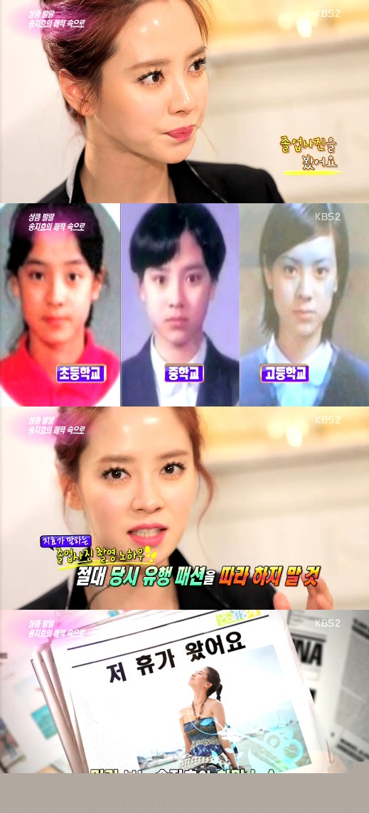 [아시아경제 e뉴스팀]배우 송지효가 졸업 사진에 대한 뼈 있는(?) 경고의 말을 전했다.18일 방송된 KBS2 '연예가중계'에서는 화보 촬영 중인 송지효를 찾아가 인터뷰를 진행하는 모습이 전파를 탔다.이날 방송을 통해 새삼 화제를 모았던 과거 학창시절 졸업사진이 공개되자, 송지효는 당혹감을 감추지 못했다. 공개된 졸업사진에는 단발머리부터 '깻잎머리'까지 당시 유행 스타일을 따라한 송지효의 모습이 담겨 있어 눈길을 끌었다.송지효는 자신의 사진들을 보며 "여러분, 일생에 단 한 번 남는 졸업 사진이다. 절대로 당시 유행 패션을 따라하지 말라"며 "평생 후회한다. 나를 봐라"라고 말해 웃음을 자아냈다.또 송지효는 "올해에는 송지효가 따뜻한 나라로 떠나 휴가 중이라는 뉴스가 나왔으면 좋겠다"는 바람을 드러내기도 했다.e뉴스팀 ent@asiae.co.kr<ⓒ세계를 보는 창 경제를 보는 눈, 아시아경제(www.asiae.co.kr) 무단전재 배포금지>