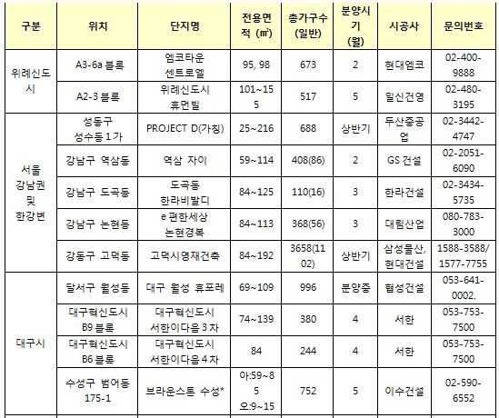 [아시아경제 배경환 기자] 지난해 분양시장을 달궜던 지역에서 올 상반기부터 신규 분양소식이 이어지고 있어 수요자들의 관심이 집중되고 있다. 서울 강남권 재건축, 한강변, 위례신도시, 대구시, 세종시 등이 대표적으로 올 상반기 해당 지역에만 7800여가구의 분양이 예정됐다.실제 지난해 가장 뜨거운 열기를 보인 위례신도시에서는 총 12개 아파트 단지가 공급됐고 이중 7곳이 1·2순위내 마감이라는 성적을 거뒀다. 특히 중소형 강세 현상 속에서 대형 주택으로만 이뤄진 위례 민간 분양단지의 활약이 눈부셨다.한동안 공급이 뜸했던 강남권 재건축 단지들도 3.3㎡당 3000만원이 넘는 분양가에도 흥행몰이에 성공해 강남권 재건축 사업에 청신호를 켰다. ‘래미안 잠원’과 ‘래미안 대치청실’이 모두 평균 25대 1의 높은 청약경쟁률을 기록했고 대림산업이 서초구 반포동에 분양한 ‘아크로리버 파크’는 3.3㎡당 4000만원에 육박하는 분양가에도 최고 42.27대 1의 경쟁률을 기록하며 전 평형을 1순위에서 털어냈다.서울에서 가장 노른자위로 꼽히는 한강변 아파트들도 영원한 스테디셀러로써의 자존심을 지켰다. 대우건설이 마포구 합정동에 분양한 초고층 주상복합 ‘마포 한강 푸르지오 1·2차가 각각 1.97대 1, 2.46대 1의 경쟁률을 기록하며 순위 내 마감됐고 삼성물산이 강동구 천호동에 공급한 초고층 아파트 ‘래미안 강동 팰리스’도 1.85대 1의 경쟁률을 기록하며 1순위에 끝났다.업계 관계자는 “부동산 경기침체가 계속되는 상황에서도 높은 청약률을 연이어 기록한 인기 지역은 수요자들에게 그 지역의 가치를 검증을 받았다는 의미로 해석되고 있다”며 “이들 지역은 뛰어난 입지와 풍부한 개발호재, 저렴한 분양가 등 수요자들을 이끌 수 있는 경쟁력을 갖춘데다 1차 검증을 이미 거친 지역인 만큼 후속에 수요자들의 관심이 높을 수 밖에 없다”고 말했다. 올해에도 청약 사업지에서 알짜 물량이 쏟아진다. 현대엠코는 오는 2월 위례신도시 A3-6a블록에 ‘엠코타운 센트로엘’을 분양한다. 지하2층, 지상 13~26층 11개동 총 673가구로 전용면적 95㎡ 161가구, 98㎡ 512가구로 구성된다. 위례신도시 시범단지에 속하는 ‘휴먼링(Human Ring)’안에 위치한다. 전 가구 남향으로 배치돼 일조권을 극대화했으며 대지면적의 40%를 조경공간으로 계획했다.한강변에서는 두산중공업이 초고층 랜드마크 아파트 ‘PROJECT D(가칭)’를 상반기에 내놓는다. 서울 성동구 성수동1가 547-1일대에 위치하며 지하 3층, 최고 47층 4개동, 총 688가구로 지어진다. 25~216㎡로 지어지며 84㎡이하가 478가구를 차지한다. 강변북로 바로 앞에 들어서기 때문에 고층 건물이 없어 한강 조망이 가능하며 서울숲과 한강시민공원을 내 집 안마당처럼 이용할 수 있다.강남 재건축 단지들도 대거 쏟아질 예정이다. GS건설은 2월 개나리6차 아파트를 재건축한 ‘역삼 자이’를 공급한다. 지하 3층 지상 최대 31층 3개동 총 408가구 중 조합원분을 제외한 114㎡ 86가구를 일반에 공급한다. 예상분양가는 3.3㎡당 3000만원 안팎으로 주변 시세보다 다소 저렴하다. 홈플러스 본사와 이마트가 가깝고 진선여자고교 도성초교를 도보로 통학할 수 있다. 여기에 도보 10분대로 2호선인 역삼역과 선릉역을 이용할 수 있다. 한라건설이 3월 강남구 도곡동 893-2 동신3차 아파트를 재건축한 ‘도곡동 한라비발디′도 대기 중이다. 84~125㎡ 110가구로 지어지는 이 단지의 일반분양 물량은 16가구다. 지하철 3호선 양재역을 걸어서 10분, 신분당선 양재역을 12분이면 이용할 수 있는 역세권 단지다. 이밖에 대림산업은 서울 강남구 논현동 일대 논현동 경복아파트를 재건축하는 ‘e편한세상 논현경복’을 3월 분양한다. 84~113㎡로 총 368가구 중 56가구가 일반에게 공급된다. 도보 10분 이내로 분당선 선릉역을 이용할 수 있으며 단지 주변으로 학동초등학교, 선릉공원 등의 생활편의시설이 밀집했다.