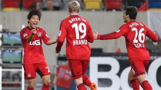 류승우(왼쪽)이 레버쿠젠 친선경기에서 골을 넣은 뒤 기뻐하고 있다. [사진=레버쿠젠 홈페이지 캡처]