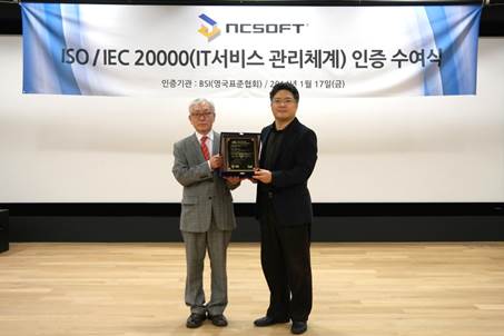 17일 진행된 인증 수여식에서 천정기 BSI코리아 회장(왼쪽)이 노병호 엔씨소프트 전무에게 상패를 전달하고 있다.