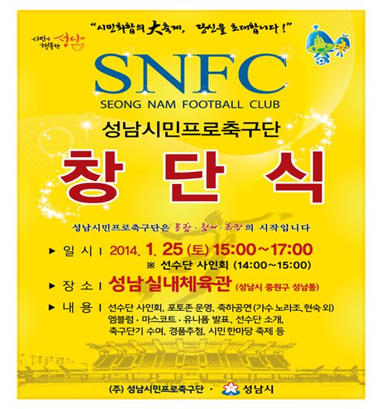 [아시아경제 김흥순 기자]프로축구 성남FC가 25일 창단식을 열고 시민구단으로 새 출발한다. 오후 3시부터 성남실내체육관에서 열리는 이번 행사에는 이재명 구단주 겸 성남시장과 신문선 대표이사, 박종환 감독과 선수단을 포함한 축구계 인사, 지역 인사, 언론인 등 약 8,000여 명이 참가한다.행사내용도 풍성하다. 본 행사에 앞서 오후 2시부터 체육관 주변에서는 다양한 사전행사들이 열린다. 선수단 사인회와 오리뜰농악의 사물놀이 공연이 펼쳐진다. 체육관 한쪽에 마련된 포토존에서는 성남 선수들과 함께 사진을 찍을 수도 있다.오후 3시부터 진행되는 본 행사 1부는 개그맨 박준형씨가 사회를 맡는다. 밸리댄스 공연, 도로공사 치어리더 공연, 성남시립국악단의 난타공연이 어우러진다. 김현욱, 권혜경 아나운서가 마이크를 잡는 2부 행사는 본격적인 창단식으로 꾸며진다. 성남FC의 탄생을 알리는 영상CF 상영으로 분위기를 한데 모은 뒤 국내외 인사들과 시민, 어린이들의 축하영상 메시지가 방영된다. 공식적인 창단 선포 뒤에는 성남FC의 새 엠블렘과 유니폼이 공개될 예정이다. 2014 시즌 성남FC를 이끌어 갈 감독 및 선수단 소개가 이어진 다음 서포터스와의 만남의 시간도 마련된다.신문선 대표이사는 "성남 축구가 시민구단으로서 새롭게 태어나는 역사적인 날이 될 것"이라며 "축구팬을 비롯한 성남시민들과 함께하는 축제의 장으로 만들겠다"고 했다.김흥순 기자 sport@asiae.co.kr<ⓒ세계를 보는 창 경제를 보는 눈, 아시아경제(www.asiae.co.kr) 무단전재 배포금지>