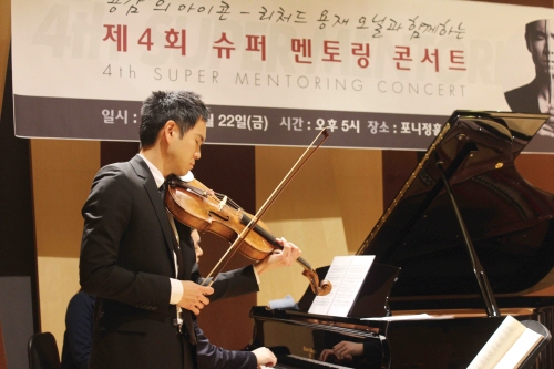 ▲ 지난해 3월 열린 슈퍼멘토링 콘서트에서 리처드 용재 오닐(Richard Yongjae ONeill)이 장애우 및 후원자 등 100명에게 연주를 들려주고 있다.