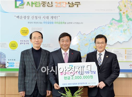 [아시아경제 노해섭 기자]대한건설협회 광주광역시회 박치영 회장은 22일 오후 남구청을 방문, 사회공헌사업의 일환으로 복지 사각지대에 있는 어려운 이웃을 돕기 위해 성금 200만 원을 최영호 광주시 남구청장에게 전달했다. 노해섭 기자 nogary@ <ⓒ세계를 보는 창 경제를 보는 눈, 아시아경제(www.asiae.co.kr) 무단전재 배포금지>