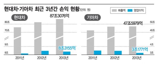 [아시아경제 조슬기나 기자, 최대열 기자] 현대기아자동차가 지난해 내수부진과 원화강세라는 대내외 악재 속에서도 사상 최대 매출을 올리는 데 성공했다. 다만 현대차의 영업이익률이 3년 만에 한 자릿수로 내려앉고 기아차의 영업이익 감소폭이 10%에 육박하는 등 더 많이 팔고도 수익성은 뚝 떨어졌다.현대차는 23일 오후 서울 양재동 본사에서 2013년 경영실적 콘퍼런스콜을 갖고 ▲판매 473만2366대 ▲매출액 87조3076억원(자동차 71조5350억원, 금융 및 기타 15조7726억원) ▲영업이익 8조3155억원을 기록했다고 밝혔다. 판매와 매출액이 전년 대비 각각 7.3% 3.4% 증가한 반면 영업이익은 1.5% 감소했다. 24일 콘퍼런스콜을 통해 공개된 기아차의 2013년 실적은 ▲판매 282만7092대 ▲매출액 47조5979억원 ▲영업이익 3조1771억원 ▲세전이익 4조8286억원 ▲당기순이익 3조8171억원이다. 판매와 매출액은 전년 대비 4.0%, 0.8% 늘었지만 영업이익은 원화 절상에 따른 매출원가율 증가 등의 요인으로 9.8% 줄었다. 현대기아차의 영업이익이 마이너스 성장을 기록한 것은 국제회계기준(IFRS)이 적용된 2011년 이후 처음이다. 현대차의 영업이익률은 지난해 9.5%를 기록하며 2010년 이후 3년 만에 한 자릿수로 떨어졌다. 기아차 역시 전년 대비 0.8%포인트 감소한 6.7%에 그쳤다. 이는 내수부진과 국내공장 생산차질, 원화 강세와 엔화 약세가 더해진 환율 변동이 부담으로 작용했다는 분석이다. 1분기 발생한 일회성 리콜 충당금, 인건비 상승 등도 수익성에 악영향을 미쳤다.이원희 현대차 재경본부장(부사장)은 "해외시장에서의 판매 호조와 연결법인 증가 효과로 매출액이 증가한 반면 환율 변동, 내수 부진과 국내공장 생산 차질이 영향을 미치며 영업이익은 줄었다"고 설명했다. 특히 기아차의 영업이익 감소폭은 10%에 육박한다. 현대차보다 기아차의 영업이익 감소폭이 두드러지는 까닭은 해외생산 비중이 더 높아 환율 영향을 더 많이 받았기 때문으로 풀이된다. 양 사의 해외생산비중은 현대차 61.5%, 기아차 43.5%다. 다만 이 같은 수익성 감소에도 불구, 업계 안팎에서는 현대기아차가 내수 부진과 원화 강세, 엔저 등 악재 속에서도 비교적 선방했다는 평가가 제기된다. 사상 최대 매출과 판매량을 달성했다는 점이 이를 뒷받침한다.양 사는 올해도 세계 경제가 본격적인 저성장 시대에 접어들며 업체 간 경쟁이 더욱 치열해지고 경영환경의 불확실성도 커질 것으로 보고 있다. 내수에서는 관세인하, 환율효과에 힘입은 수입차, 해외에서는 엔저기조에 따른 일본 경쟁사의 공세가 지속될 전망이다.현대기아차 관계자는 "신차 출시, 서비스 차별화를 통해 내수 시장 수성에 나서는 한편 글로벌 생산거점을 적극 활용한 해외시장 판매 확대에도 힘쓸 계획"이라고 말했다.현대기아차는 올해 글로벌 시장에서 전년 판매량 대비 4% 증가한 786만대를 판매한다는 목표다. 현대차와 기아차가 각각 490만대(국내 68만2000대, 해외 421만8000대), 296만대(내수 48만대, 해외 248만대)의 목표를 제시했다. 조슬기나 기자 seul@asiae.co.kr최대열 기자 dychoi@asiae.co.kr<ⓒ세계를 보는 창 경제를 보는 눈, 아시아경제(www.asiae.co.kr) 무단전재 배포금지>