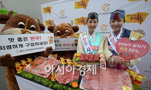 [아시아경제 윤동주 기자] 민족의 명절인 설을 앞두고 27일 서울 청계광장에서 한우자조금관리위원회 주최로 열린 '설맞이 한우 직거래장터'에서 한복을 입은 모델들이 한우를 소개하고 있다.윤동주 기자 doso7@asiae.co.kr<ⓒ세계를 보는 창 경제를 보는 눈, 아시아경제(www.asiae.co.kr) 무단전재 배포금지>