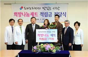 [아시아경제 이광호 기자]도미노피자가 27일 서울대학교 어린이병원에 소외계층 환아들을 위한 '희망나눔기금' 1억원을 전달했다고 밝혔다. 희망나눔기금은 도미노피자 세트 판매 수익금 일부를 적립해 마련한 후원기금으로 소외계층 환아들의 의료비 및 소아질환 연구비 지원을 목적으로 사용된다. 도미노피자는 지난 2005년부터 서울대어린이병원, 강남세브란스병원 등에 희망나눔기금을 전달하며 소외 환아를 위한 나눔 활동을 이어 오고 있다. 이날 행사에는 오광현 도미노피자 회장과 오병희 서울대병원장, 도미노피자 광고모델 수지, 공유가 참석한 가운데 기금 전달식이 진행됐으며 희망나눔기금 수혜 환아의 병실을 방문해 아이들의 건강을 기원하고 희망의 메시지를 전하는 시간을 가졌다. 또한 '희망나눔 피자파티'를 마련, 기금 전달식에 참석한 광고모델 수지, 공유가 어린이병원 5∼7층 병동을 직접 찾아가 환아 및 가족들에게 현장에서 갓 구운 피자를 나눠주며 즐겁고 뜻 깊은 시간을 보냈다. 차현주 도미노피자 실장은 "희망나눔기금은 도미노피자 세트 메뉴 판매 수익금 일부로 마련한 후원금인 만큼 고객들의 소비가 곧 기부로 이어지는 착한 소비 활동의 결과물"이라며 "9년째 이어져오는 서울대어린이병원 나눔 활동을 비롯해 다양한 나눔 경영으로 도미노피자 고객과 함께 더욱 많은 환아들에게 도움의 손길을 전달할 수 있도록 노력하겠다"고 말했다.이광호 기자 kwang@asiae.co.kr<ⓒ세계를 보는 창 경제를 보는 눈, 아시아경제(www.asiae.co.kr) 무단전재 배포금지>
