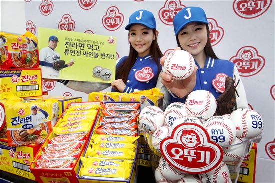 오뚜기가 진라면 스페셜 패키지 출시를 기념하고자 '진라면 먹고 류현진 싸인볼 받자'라는 내용의 사진행사를 진행했다. 모델들이 류현진 사인볼을 들어보이고 있다. 이광호 기자 kwang@asiae.co.kr<ⓒ세계를 보는 창 경제를 보는 눈, 아시아경제(www.asiae.co.kr) 무단전재 배포금지>