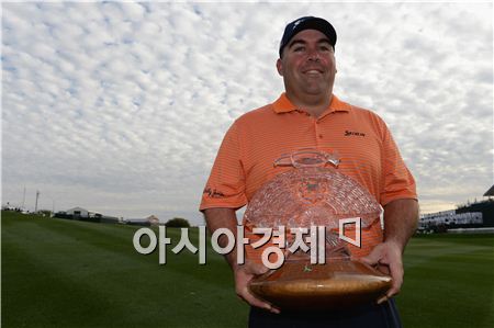 케빈 스태들러가 피닉스오픈 우승 직후 트로피를 들고 기뻐하고 있다. 스코츠데일(美애리조나주)=Getty images/멀티비츠.