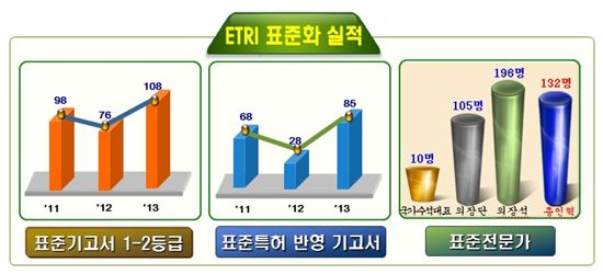 [아시아경제 김영식 기자]국내를 대표하는 정보통신기술분야 연구기관인 한국전자통신연구원(ETRI)이 지난해 국제표준화 실적에서 7000억원 이상 자산가치를 갖는 표준특허 실적을 올렸다. ETRI는 5일 지난해 국제전기통신연합(ITU), 국제전기전자기술자협회(IEEE), 국제표준화기구(ISO) 등 30여개 국제표준 기구에서 총 132명의 국제표준전문가 및 196석의 국제표준화 기구 의장단을 수임했다고 밝혔다. 또 1717건에 달하는 국제 표준화 기고 활동을 통해 국제 표준 23건 제정, 표준특허 67건 확보 및 국제 표준 85건 반영 등의 성과를 거뒀다.표준전문가 총 132명 중 국제 표준화 단체에서의 의장, 에디터 등 핵심적인 역할을 수행하고 있는 의장단만 105명에 이른다. 총 196석의 의석 중 국제 표준화 기구의 대한민국 수석대표 역할을 수행하는 인력은 10명이다.아울러 지난해 표준기고서 최상위 등급인 1-2등급은 총 108편 이었다. 이중 상당수가 표준특허를 기반으로 하고 있어 표준의 효율성 측면에서 성과 극대화가 이뤄졌으며 실제로 최근 표준화 성과 대비 표준특허 연계 비율이 급격하게 증가하고 있다고 ETRI는 밝혔다.이같은 실적은 최근 ETRI가 추진 중인 국제표준 중심의 특허경영 결과로, 표준특허 가치를 건당 1000만달러로 산정하면 약 7300억원의 잠재 자산가치를 갖는다고 ETRI는 설명했다. ETRI가 그동안 이룬 표준특허 누적분은 376건에 달하며 잠재 자산가치는 4조원으로 평가된다.▲ ETRI가 5일 발표한 지난해 국제표준화 활동의 성과. 특허획득, 승인표준기고서, 기구 의장단, 표준화 전문가, 기고서 채택 등 최근 5년간 지표가 대체로 증가세를 보여주고 있다