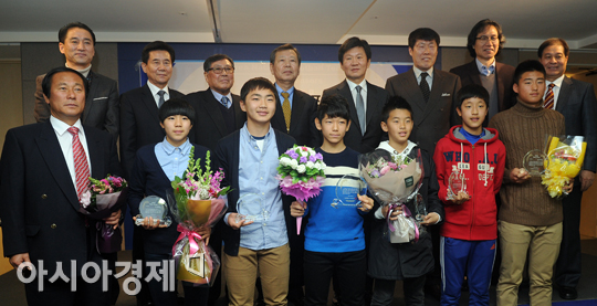 [아시아경제 정재훈 기자] 5일 오후 서울 신문로 축구회관에서 열린 제26회 차범근 축구상 시상식에서 수상자들이 차범근 이사장, 정몽규 대한축구협회장 등 내빈들과 기념촬영을 하고 있다. 정재훈 기자 roze@asiae.co.kr<ⓒ세계를 보는 창 경제를 보는 눈, 아시아경제(www.asiae.co.kr) 무단전재 배포금지>