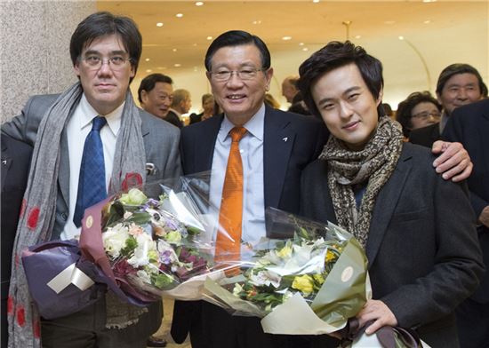 금호아시아나문화재단 박삼구 이사장(가운데)이 뉴욕 필하모닉 지휘자 앨런 길버트(왼쪽)와 이날 뉴욕필과 협연한 피아니스트 김다솔(오른쪽)과 기념촬영을 하고 있다.