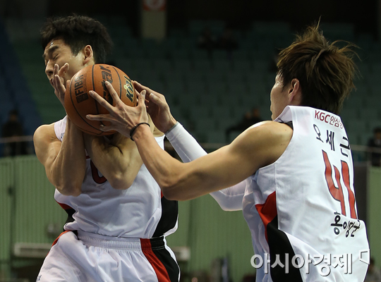 [아시아경제 정재훈 기자] 7일 오후 잠실실내체육관에서 열린 KB국민카드 2013-2014 프로농구 삼성과 KGC의 경기. KGC 김윤태와 오세근이 리바운드를 잡기 위해 손을 뻗고 있다. 정재훈 기자 roze@asiae.co.kr<ⓒ세계를 보는 창 경제를 보는 눈, 아시아경제(www.asiae.co.kr) 무단전재 배포금지>