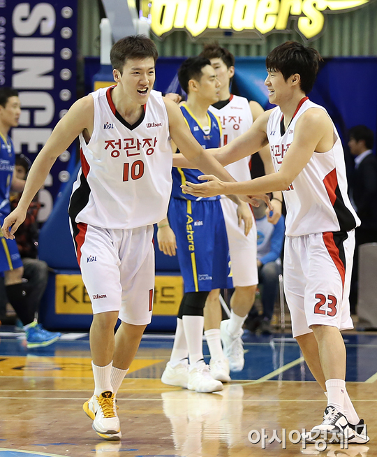 [아시아경제 정재훈 기자] 7일 오후 잠실실내체육관에서 열린 KB국민카드 2013-2014 프로농구 삼성과 KGC의 경기. 84:83 역전승을 거둔 KGC 선수들이 기뻐하고 있다. 정재훈 기자 roze@asiae.co.kr<ⓒ세계를 보는 창 경제를 보는 눈, 아시아경제(www.asiae.co.kr) 무단전재 배포금지>