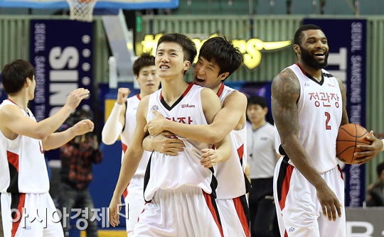 [아시아경제 정재훈 기자] 7일 오후 잠실실내체육관에서 열린 KB국민카드 2013-2014 프로농구 삼성과 KGC의 경기. 84:83 역전승을 거둔 KGC 선수들이 기뻐하고 있다. 정재훈 기자 roze@asiae.co.kr<ⓒ세계를 보는 창 경제를 보는 눈, 아시아경제(www.asiae.co.kr) 무단전재 배포금지>