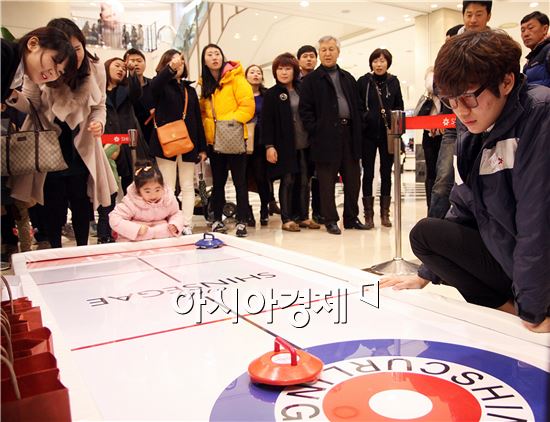 광주신세계 1층에 마련된 컬링경기 체험장에서 고객들이 '컬렁 이벤트에 참여하고 있다. 광주신세계는 '2014 소치 올림픽' 개막에 맞춰 한국 선수단의 선전을 기원하며 컬링 경기 체험장을 마련했다. <br />