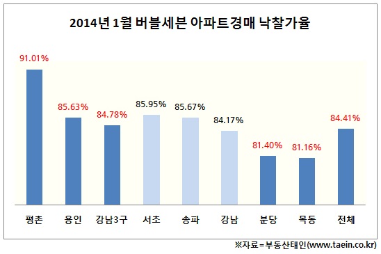 [아시아경제 이민찬 기자] 과거 부동산 과열을 주도했던 이른바 '버블세븐' 지역 아파트 경매 낙찰가율이 전 지역에서 일제히 80%를 넘어섰다. 지난 2011년 2월 이후 35개월 만에 처음이다. 곳곳에서 부동산 거래 정상화에 대한 기대감이 높아지고 있다.10일 부동산경매정보업체 부동산태인에 따르면 버블세븐(강남3구, 목동, 분당, 평촌, 용인)의 지난 1월 아파트(338건) 경매 결과, 평균 낙찰가율이 2011년 2월(84.66%) 이후 가장 높은 84.41%를 기록했다. 이는 전월 대비 3.91%포인트 오른 것이며 지난해 같은 달보다는 무려 10.9%포인트 상승한 수치다.이 가운데 낙찰가율이 가장 높은 곳은 평촌으로 91.01%를 기록, 버블세븐의 반등을 주도했다. 평촌 다음으로 낙찰가율이 높은 곳은 미분양 아파트의 무덤이라고 불리던 용인으로 지난달 평균 낙찰가율이 85.63%를 기록했다. 2009년 9월 이후 최고치다. 아파트값이 상대적으로 높게 형성된 강남3구(강남·서초·송파)도 84.78%를 기록했다. 이는 2011년 2월(85.44%) 이후 가장 높은 낙찰가율이다. 서초구 아파트 낙찰가율이 85.95%로 가장 높았다. 이어 송파구와 강남구도 각각 85.67%, 84.17%의 낙찰가율을 기록했다.분당과 목동 또한 비슷한 분위기다. 분당이 81.4%의 낙찰가율을 기록하면서 목동(81.16%)을 근소하게 앞섰다. 두 지역의 경우 지난해 말 낙찰가율 상승세가 주춤했지만 80% 선을 유지했다.버블세븐 지역은 다른 지역보다 입찰경쟁률도 치열하다. 지난 달 버블세븐 아파트 경매 입찰경쟁률은 8.38대 1로 2009년 7월(8.44대 1) 이후 4년 반 만에 가장 높은 수치를 기록했다. 특히 평촌과 용인은 각각 11.3대 1, 10.6대의 높은 경쟁률을 기록, 버블세븐 상승세를 주도했다.이처럼 버블세븐 아파트가 연초 경매시장에서 좋은 성적을 내고 있는 건 지난해 꾸준히 진행된 부동산 규제 완화로 인한 상승세에 우수한 생활환경 등이 반영된 결과라는 분석이다. 실제로 지난달 수도권 아파트 경매 평균 낙찰가율은 82.78%로 집계됐다. 이는 지난 2011년 4월 이후 최고치다. 정대홍 부동산태인 팀장은 "버블세븐은 학군과 교육시설이 우수하고 대중교통과 도로망이 잘 발달돼 있다"면서 "부동산시장 침체가 시작될 때 가격 거품론이 불거지며 다른 지역 대비 집값 하락폭이 더 컸던 게 오히려 최근 경매 수요자들에게 매력적으로 작용한 것으로 보인다"고 말했다.이민찬 기자 leemin@asiae.co.kr<ⓒ세계를 보는 창 경제를 보는 눈, 아시아경제(www.asiae.co.kr) 무단전재 배포금지>