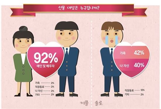 [아시아경제 장인서 기자]밸런타인데이를 맞아 배우자나 애인이 있는 사람 대부분이 초콜릿과 선물을 준비하는 가운데 솔로족은 가족이나 자신을 위한 선물을 구입하는 것으로 조사됐다.10일 옥션에 따르면 밸런타인데이 선물 계획에 대해 회원 910명을 대상으로 설문조사를 실시한 결과 애인이 있는 미혼자의 86.7%, 기혼자의 74.6%가 선물 계획이 있다고 답했다. 또한 싱글족의 경우 절반에 가까운 46.5%가 밸런타인데이 선물을 계획하고 있다고 답했으며, 이중 42%는 가족에게 40%는 자신에게 선물을 계획하고 있었다. 성별로 살펴보면 솔로남의 55%가 셀프선물을, 솔로녀의 54%가 가족에게 선물을 계획 중인 것으로 나타났다. 전체 응답자 중 69%가 선물을 준비한다고 답한 가운데 43%가 초콜릿 외에 다른 선물을 함께 준비한다고 답했고, 응답자 중 90%는 선물 대상이 뭘 원하는지 미리 알기를 바랐다. 초콜릿과 사탕 외에 받고 싶은 선물로는 남성의 경우 화장품(30%), IT기기(27%), 커플링(15%) 순으로 답했고, 여성(화이트데이)은 화장품(40%), 커플링(25%), 꽃?인형(7%) 순이었다. 손편지, 수공예제품 등에 대해서는 응답이 저조했다. 한편 선물 부담을 줄이기 위해서 응답자의 58%가 e쿠폰과 모바일상품권을, 29%가 할인 및 공동구매를 활용할 계획이라고 답했다. 응답자의 33%는 DIY로 초콜릿을 준비해 부담을 줄이겠다고 답했다. 지경민 옥션 온사이트마케팅팀 부장은 "전통적으로 초콜릿을 선물하던 밸런타인데이 풍습이 특별한 선물까지 덤으로 선물하는 문화로 바뀌면서 비용 부담을 느낀 소비자들이 e쿠폰과 모바일쿠폰 등을 많이 활용하고 있다"고 말했다. 옥션은 오는 14일까지 '페레로로쉐' 등 인기 초콜릿과 커피·외식·영화 관람권 등 데이트용 모바일쿠폰-e쿠폰 상품을 할인하는 '모두의 발렌타인데이' 행사를 진행한다. 장인서 기자 en1302@asiae.co.kr<ⓒ세계를 보는 창 경제를 보는 눈, 아시아경제(www.asiae.co.kr) 무단전재 배포금지>