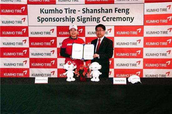 (사진 왼쪽부터) 펑샨샨 선수와 주경태 금호타이어 영업기획담당 임원이 스폰서십 조인식에 참석해 기념촬영을 하는 모습.