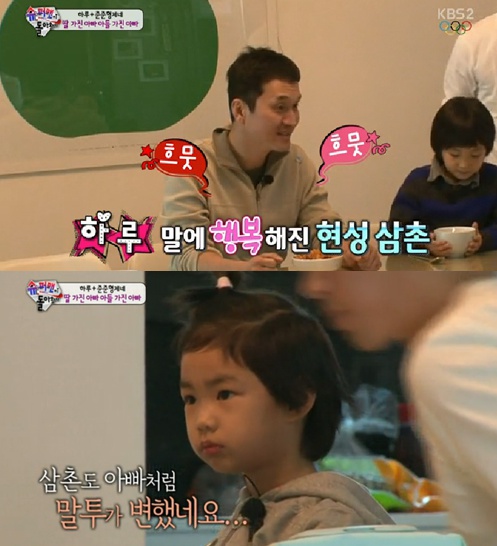 [아시아경제 온라인이슈팀] 배우 장현성이 '하루앓이' 중 임을 고백했다.9일 방송된 KBS2 '해피선데이-슈퍼맨이 돌아왔다'(이하 슈퍼맨)에서는 장현성이 자신의 두 아들과 함께 가수 타블로의 집을 방문하는 모습이 전파를 탔다.이날 장현성은 타블로의 딸 하루를 보며 "너무 귀엽다"며 "하루를 보면 흐물흐물해지는 기분이다"라고 말했다.이에 배우 강혜정은 "아들만 있는 집은 딸이 부럽고 딸만 있는 집은 아들이 부러울 때가 있다"며 "오빠는 딸 낳아야겠다"고 말했다. 한편 하루의 혀 짧은 소리도 화제다. 하루는 장현성의 두 아들에게 "나중에 집에 놀러 갈게"라고 말하자 장현성은 혀 짧은 소리로 "놀러와. 삼촌이 재밌게 해줄게"라고 답했다.이어 장현성은 "타블로가 (하루를 향해) 혀 짧은 말투를 할 때마다 '조금 심한 것 아닌가' 라고 생각했는데, 나는 3분도 안 돼서 똑같이 된다"고 덧붙였다.장현성 하루앓이와 관련 된 방송을 접한 네티즌은 "장현성 하루앓이, 딸 가지시겠네요", "장현성 하루앓이, 나도 딸 낳고 싶다", "장현성 하루앓이, 아들 가진 입장은 그럴 수 있겠다" 등의 반응을 보였다. 온라인이슈팀 <ⓒ세계를 보는 창 경제를 보는 눈, 아시아경제(www.asiae.co.kr) 무단전재 배포금지>