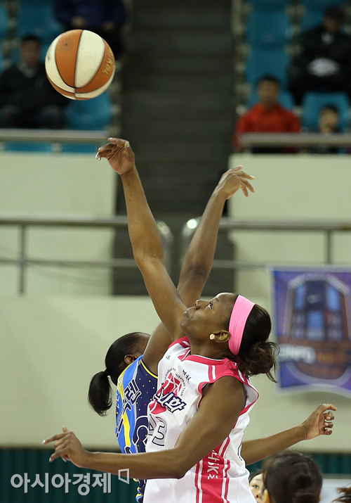 [부천=아시아경제 정재훈 기자] 10일 오후 부천실내체육관에서 열린 우리은행 2013-2014 여자프로농구 하나외환과 신한은행의 경기. 하나외환 나키아샌포드와 신한은행 스트릭렌이 점프볼을 다투고 있다. 정재훈 기자 roze@asiae.co.kr<ⓒ세계를 보는 창 경제를 보는 눈, 아시아경제(www.asiae.co.kr) 무단전재 배포금지>