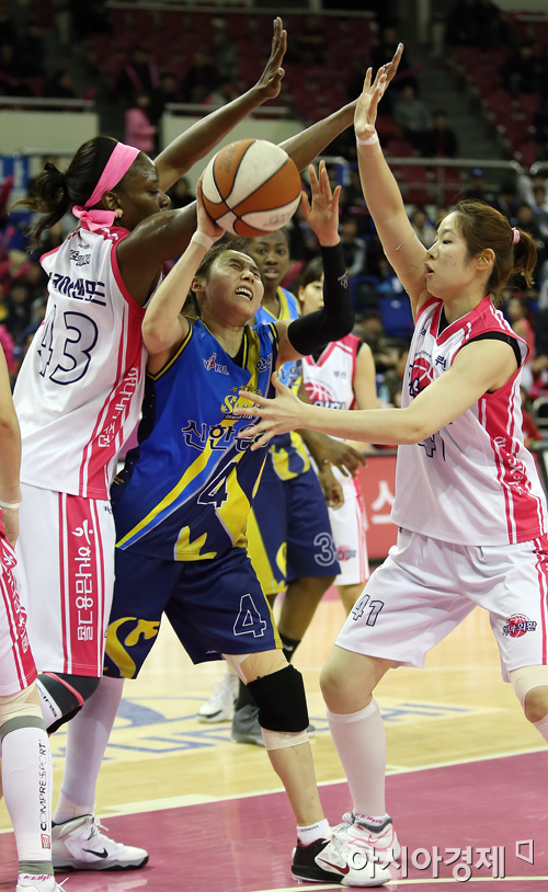 [부천=아시아경제 정재훈 기자] 10일 오후 부천실내체육관에서 열린 우리은행 2013-2014 여자프로농구 하나외환과 신한은행의 경기. 신한은행 최윤아가 하나외환 나키아샌포드와 이유진의 수비를 받고 있다. 정재훈 기자 roze@asiae.co.kr<ⓒ세계를 보는 창 경제를 보는 눈, 아시아경제(www.asiae.co.kr) 무단전재 배포금지>
