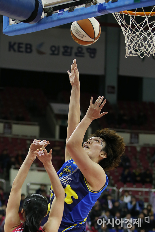 [부천=아시아경제 정재훈 기자] 10일 오후 부천실내체육관에서 열린 우리은행 2013-2014 여자프로농구 하나외환과 신한은행의 경기. 신한은행 하은주가 슛을 시도하고 있다. 정재훈 기자 roze@asiae.co.kr<ⓒ세계를 보는 창 경제를 보는 눈, 아시아경제(www.asiae.co.kr) 무단전재 배포금지>