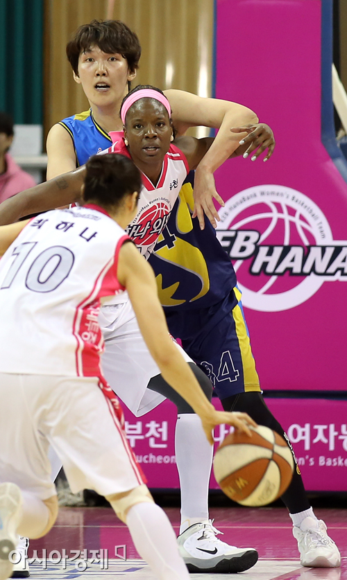 [부천=아시아경제 정재훈 기자] 10일 오후 부천실내체육관에서 열린 우리은행 2013-2014 여자프로농구 하나외환과 신한은행의 경기. 신한은행 하은주가 하나외환 나키아샌포드를 마크하고 있다. 정재훈 기자 roze@asiae.co.kr<ⓒ세계를 보는 창 경제를 보는 눈, 아시아경제(www.asiae.co.kr) 무단전재 배포금지>