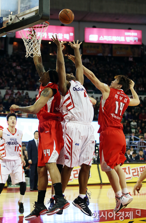 [아시아경제 정재훈 기자] 11일 오후 서울 잠실학생체육관에서 열린 KB국민카드 2013-2014 프로농구 SK와 오리온스의 경기. 양 팀 선수들이 리바운드를 잡기 위해 점프하고 있다. 정재훈 기자 roze@asiae.co.kr<ⓒ세계를 보는 창 경제를 보는 눈, 아시아경제(www.asiae.co.kr) 무단전재 배포금지>