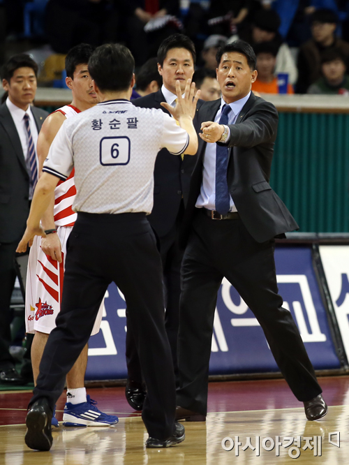 [아시아경제 정재훈 기자] 11일 오후 서울 잠실학생체육관에서 열린 KB국민카드 2013-2014 프로농구 SK와 오리온스의 경기. 오리온스 추일승 감독이 판정에 항의하고 있다. 정재훈 기자 roze@asiae.co.kr<ⓒ세계를 보는 창 경제를 보는 눈, 아시아경제(www.asiae.co.kr) 무단전재 배포금지>