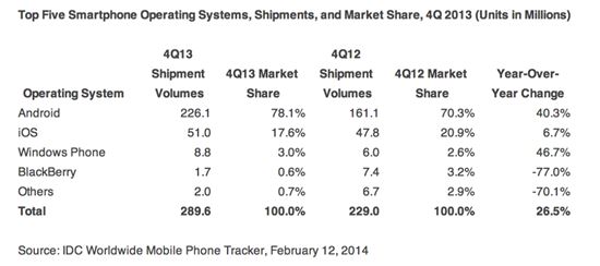 [아시아경제 권용민 기자] 지난해 4분기 전 세계 스마트폰 시장에서 구글의 안드로이드 운영체제(OS) 점유율은 애플 iOS의 4배에 달했던 것으로 나타났다. 12일(현지시간) 시장조사업체 IDC에 따르면 지난 4분기 구글 안드로이드와 애플 iOS의 복점체제는 전체의 95.7%를 기록했다. 이는 2012년 4분기(91.2%)에 비해 4.5% 상승한 수치다.이 중 대부분은 안드로이드 OS가 차지했다. 조사 결과에 따르면 95.7% 중 78.1%는 안드로이드의 점유율이었다. iOS는 17.6%에 불과했다. 안드로이드 기반 스마트폰은 2013년 한 해 8억대가 판매됐다.iOS의 성장률은 지난 4분기 6.7%, 2013년 한 해 12.9%로 역대 가장 낮았던 것으로 나타났다. 이 같은 낮은 성장률을 보인 것에 대해 IDC는 애플이 저가형 스마트폰 시장에 대응하지 못했기 때문이라고 분석했다. 또 큰 화면이 탑재된 스마트폰을 출시하지 않은 것도 경쟁에서 밀린 원인으로 꼽았다.한편 윈도폰은 2012년 4분기 대비 0.4% 오른 3%를 기록했다. 블랙베리는 0.6%로 전년 동기(3.2%) 대비 크게 떨어졌으며 기타 OS는 0.7%의 점유율을 보였다.권용민 기자 festym@asiae.co.kr<ⓒ세계를 보는 창 경제를 보는 눈, 아시아경제(www.asiae.co.kr) 무단전재 배포금지>